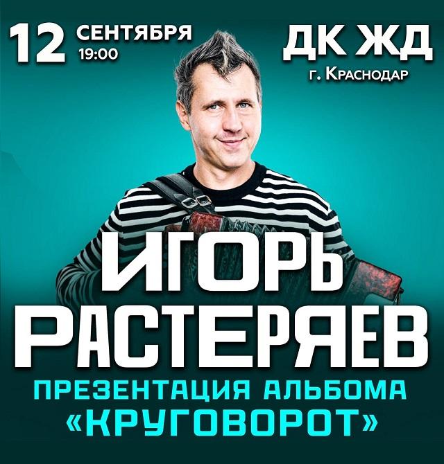 Игорь Растеряев представит свой новый альбом «Круговорот» в г. Краснодаре, на большом концерте, 12 сентября, в ДК ЖД! Долгожданная пластинка Игоря Растеряева получила символическое название «Круговорот». По словам музыканта, оно максимально точно отражает концепцию этой очень непростой, но важной для него работы. Новые песни были написаны Игорем за год, и образуют цельную историю, объединённую общим контекстом и единой философией. Всего в «Круговорот» вошло 11 созвучных по смыслу композиций, одну из которых – «Вахту» – зрители уже могли слышать на концертах. Слушателей ждут откровенные авторские размышления и проникновенная лирика под звучный аккомпанемент сердечной гармошки.