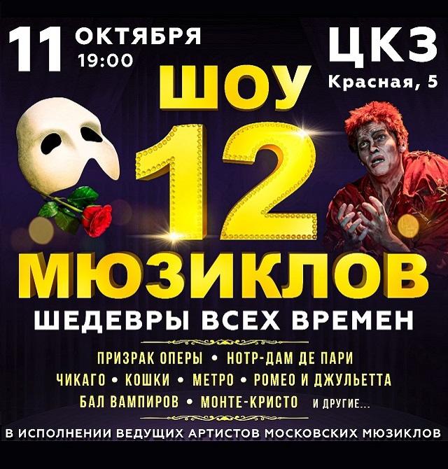 Грандиозное, феерическое шоу из произведений которые покорили Мировые сценические площадки, Бродвея, Лондона, Парижа и Москвы! 12 Мюзиклов это симбиоз оригинальных костюмов и образов, потрясающих вокальных партий и мультимедийных декораций, которые погрузят зрителя в удивительный Мир Любви, Тайных страстей и Потрясающих эмоций!!