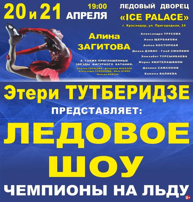 0+Ледовое шоу "Чемпионы на льду" 21 Апр, всот: 1200 руб.Ледовый дворец ice Palaceг. Краснодар, ул. Пригородная, 24/БПосмотреть на карте ✭ Билет не надо распечатывать✭ Билет не надо обменивать в кассе✭ Билет достаточно предъявить на экранеЛедовое шоу Этери Тутберидзе