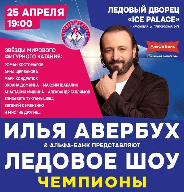 25 апреля в городе Краснодаре, в рамках тура по городам России, состоится грандиозное ЛЕДОВОЕ ШОУ ИЛЬИ АВЕРБУХА «ЧЕМПИОНЫ».