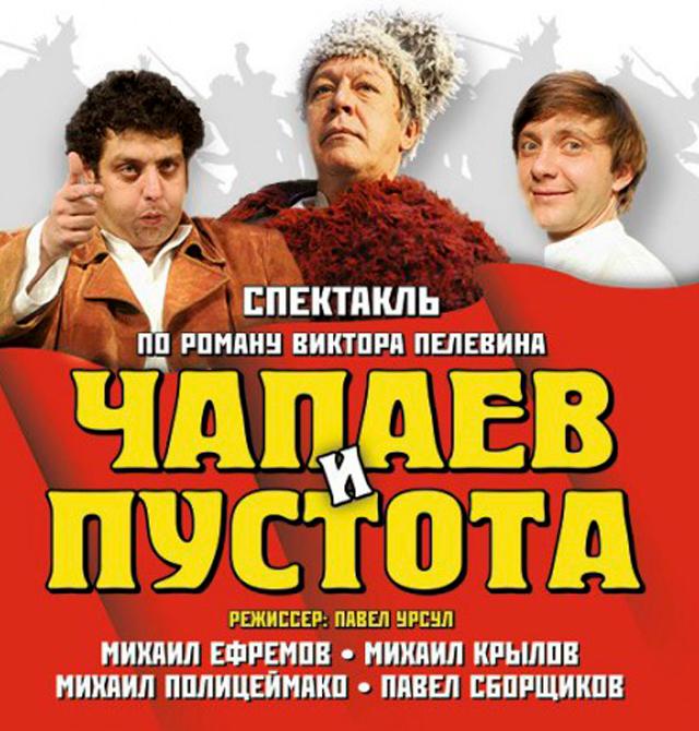 Необычный литературный материал, смелая режиссура и звездный актерский состав вот уже 15 лет пользуются невероятным успехом у публики. Непредсказуемый Михаил Ефремов в роли Чапаева, виртуоз Михаил Крылов – Петр Пустота, весельчак и шоумен Михаил Полицеймако – Котовский, молодая и талантливая Мария Козакова – Анка-пулеметчица и брутальный красавец Павел Сборщиков – Сердюк. Несомненно, это как раз тот случай, когда сумма всех слагаемых больше, чем каждый актер по отдельности. Ставить спектакль по Пелевину – это не просто вызов. Ведь воплощать на сцене действие, которое «происходит в абсолютной пустоте» – задача не из легких. Но творческое трио – Евгений Сидихин, Александр Наумов и режиссер Павел Урсул – мастерски выдало свое видение нашумевшего романа, ведь постановка понятна даже тем, кто книгу не читал. И, судя по долгожительству спектакля, это удалось! Зритель оказывается между двумя мирами, в одном из которых – герой-комдив Василий Иванович Чапаев и его оруженосец Петька стараются разобраться в целесообразности всего происходящего во вселенной, а в другом – пациент психиатрической лечебницы пребывает в мире своих сюрреалистических грёз. В невероятную игру включаются и другие «психи»: бородатый мужчина представляет себя Просто Марией и ходит на свидания с Арнольдом Шварценеггером, а группа больных во главе с Котовским «объедается грибами в поисках вечного кайфа»… Несмотря на кажущуюся бесшабашность сюжета, «Чапаев и Пустота» – спектакль философский, пронзительно грустный и, при этом, невероятно смешной и современный. Звездам театра и кино Михаилу Ефремову, Михаилу Полицеймако и остальным задействованным в постановке актерам удается филигранно объединить все эпохи, в которых разворачиваются события, – гражданскую войну, современную психушку и великую Пустоту, в которую, наконец, уходят герои…