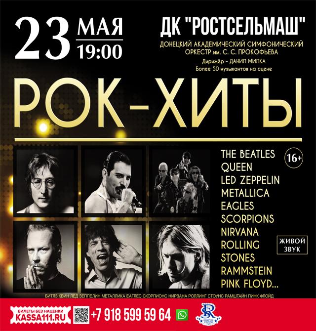В концерте прозвучат легендарные композиции всемирно известных рок-групп и исполнителей: The Beatles, Queen, Pink Floyd, Rolling Stones, Led Zeppelin, Metallica, Eagles, Scorpions, Nirvana, Rammstein. Более 50 музыкантов Донецкого академического симфонического оркестра им С.С.Прокофьева, на сцене дворца культуры «Ростсельмаш» г. Ростова-на-Дону исполнят в живую Ваши любимые хиты.