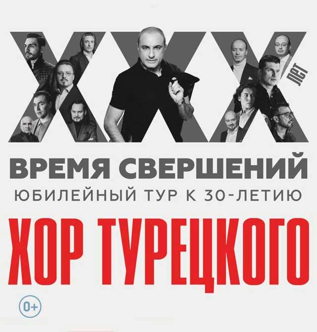 Музыка, вдохновляющая сотни людей во всём мире. Легендарный «Хор Турецкого» отметит свой юбилей в Вашем городе. Никаких рамок и ограничений. Ведь 30 лет – это время свершений! Самые крупные площадки страны, самые уникальные голоса в природе, самый широкий репертуар: от мировых хитов и нескучной классики до поразительной акапеллы и романтических баллад.