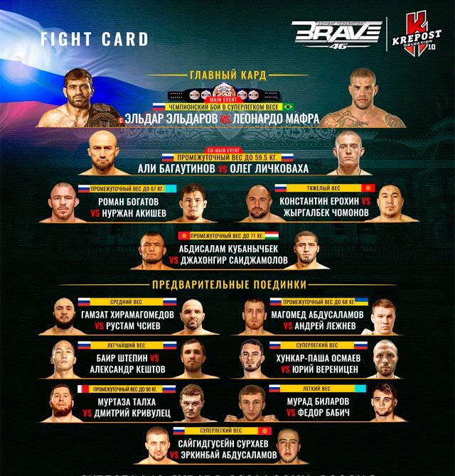 Чемпион мира в суперлегком весе Эльдар Эльдаров возглавит вечер боев и сразится с бразильским нокаутером Леонардо Мафрой. Также на турнире будут драться известные российские и мировые звезды ММА, среди которых Али Багаутинов, Роман Богатов, Константин Ерохин.