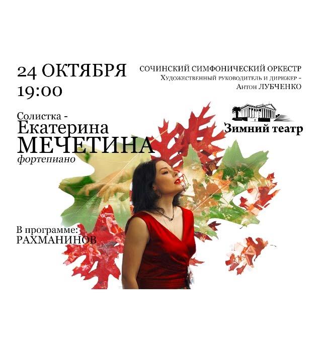 Солистка – Екатерина МЕЧЕТИНА (ф-но) Сергей РАХМАНИНОВ (1873-1943) «Вокализ» для симфонического оркестра, соч.34 (1912); Концерт для ф-но с оркестром N. 1, фа-диез минор, соч.1 (1891); Симфония N.2, ми минор, соч.27 (1907) Соло в оркестре - Данил Бабин (кларнет) Сочинский симфонический оркестр Художественный руководитель и дирижёр - АНТОН ЛУБЧЕНКО Концерт проходит при поддержке Фонда Сочинского симфонического оркестра Продолжительность концерта - 2,5 часа с антрактом